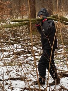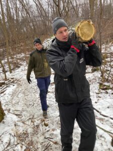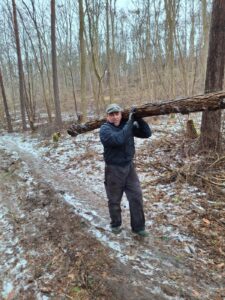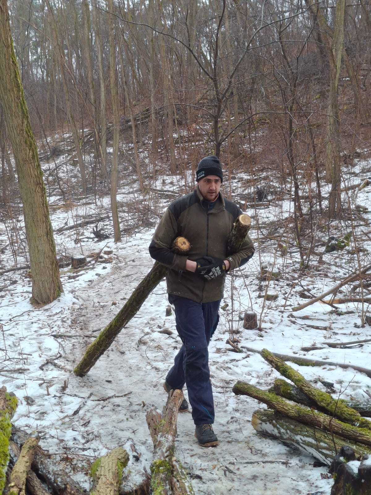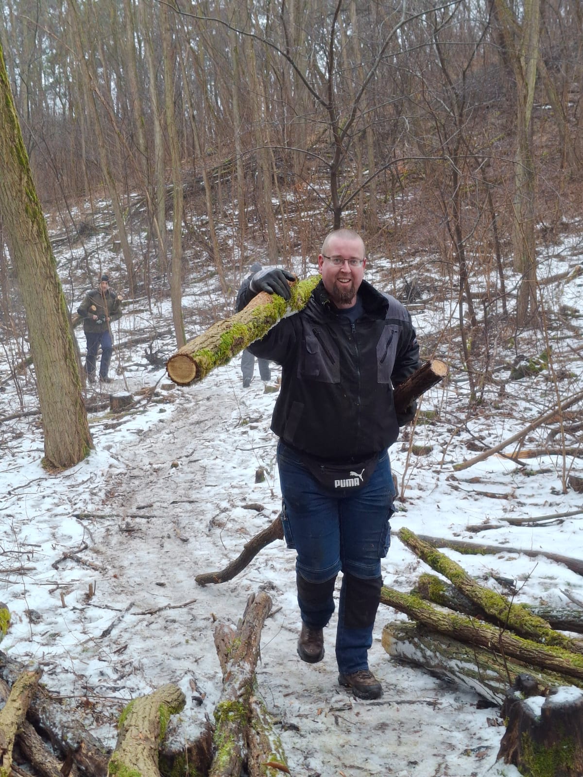 Aufgrund der vereisten Wege mussten die Baumstämme in etlichen Fußmärschen aus dem Wald geschleppt werden. Fitnessstudio? Überbewertet.